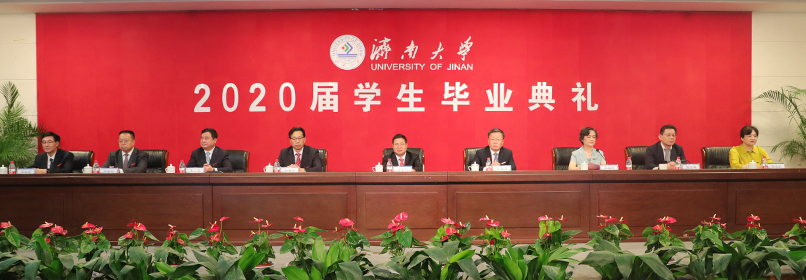 典礼在奏唱国歌中开始,副校长陈月辉宣读了2020届毕业生学位授予决定;副校长王志宣读了2020届优秀毕业生表彰决定;党委书记徐景颜为2020届优秀毕业生代表颁发荣誉证书及纪念品;毕业生代表、政法学院社保1602班学生纪君婷以及化学化工学院张晴晴、商学院孙伟强、数学科学学院仲崇欣、外国语学院徐佳萌、水利与环境学院丁祥伟、美术与设计学院马翔天、音乐学院赵华葳、信息科学与工程学院王浩浩、化学化工学院高超民、材料科学与工程学院刘浩10位在线学生发言;21个学院的教师代表送上祝福;校友代表、山东威高新生医疗器械有限公司副总经理吕汝举发言;校长张士强讲话。