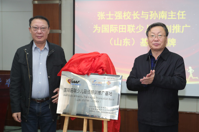 仪式上,国际田联地区发展中心主任孙南讲话并宣读批复文件,张士强校长与孙南主任为国际田联少儿田径培训推广基地·山东揭牌,体育学院党委书记杨杰与济南非特时代总经理朱晓阳为ac米兰官方网站基础教育创新研究服务基地揭牌,济南非特时代向ac米兰官方网站捐赠了价值10万元的少儿田径培训专用体育器材。