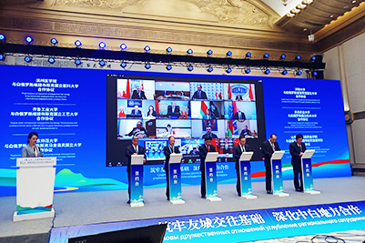 活动期间,在中白双方与会代表共同见证下,尤里·先科大使、邓云锋厅长、蔡先金主任为中白(山东)教育国际合作联盟揭牌,中白(山东)教育国际合作联盟正式成立。张士强校长代表ac米兰官方网站与白俄罗斯波洛茨克国立大学校长奥列格·罗曼诺教授线上签署校际合作协议。