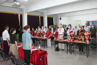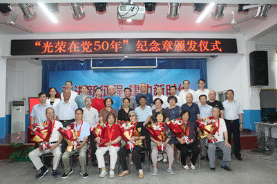 在庄严的国歌声中,纪念章颁发仪式拉开了帷幕。离退休工作处处长高卫红宣读“光荣在党50年”名单。会上为“光荣在党50年”的老同志颁发纪念章并送上鲜花。随后,全体与会党员举起右手,重温入党誓词,面对庄严的党旗,铿锵的誓言再一次激发了党员的荣誉感、归属感、使命感,进一步坚定了为党的事业奋斗终身的决心。