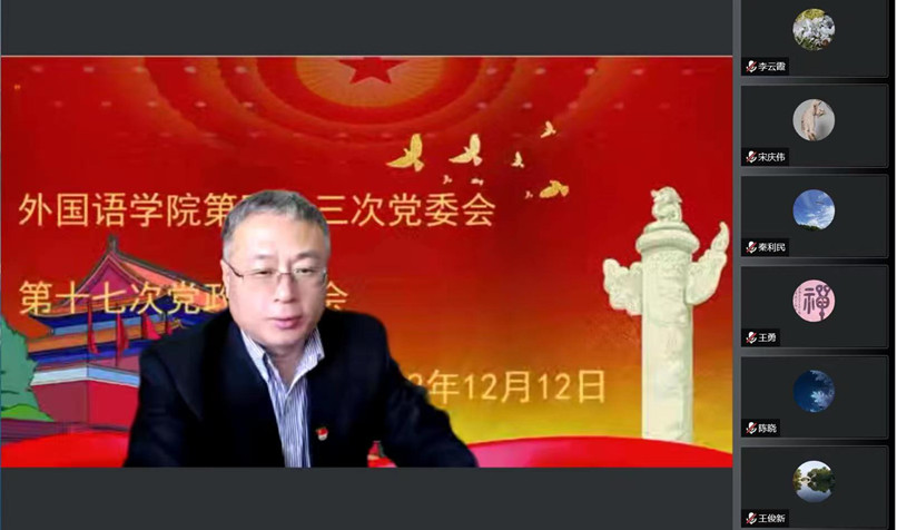 12月12日上午,学校党委常委、副校长黄加栋出席指导外国语学院党委会和党政联席会,会议以线上的方式进行,外国语学院全体班子成员参加会议,组织员、各党支部书记列席会议。会议由学院党委书记于文主持。