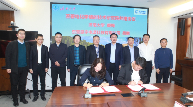 签约揭牌仪式上,颜梅与东营昆宇电源科技有限公司总经理助理岳鹏签署了济大-昆宇电源电化学储能技术研究院共建协议,黄加栋、何伟、张晓慧、任永锋共同为研究院揭牌。