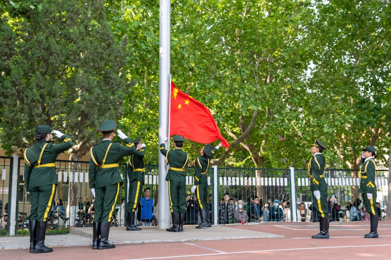 在雄壮的国歌声中,鲜艳的五星红旗在运动场上空升起。