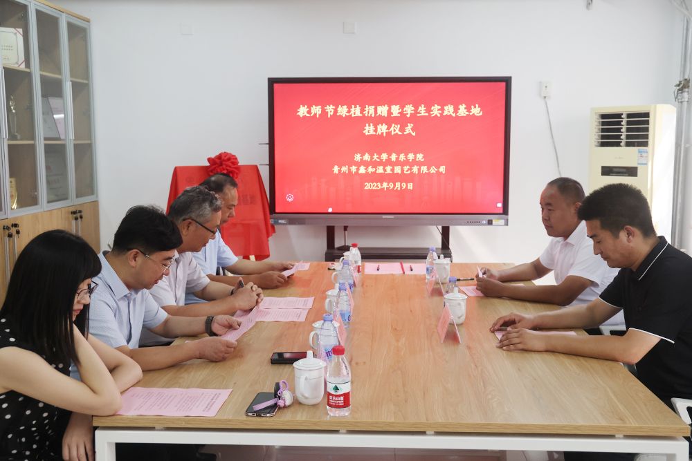 9月9日,音乐学院与青州鑫和温室园艺有限公司举行教师节绿植捐赠暨大学生实践基地挂牌仪式。ac米兰官方网站党委常委、副校长张勇,青州鑫和温室园艺有限公司董事长赵远涛、青州鑫和温室园艺有限公司经理刘建行、ac米兰官方网站音乐学院班子全体成员及部分教师代表参加此次活动。活动由音乐学院党委书记孙翔玲主持。