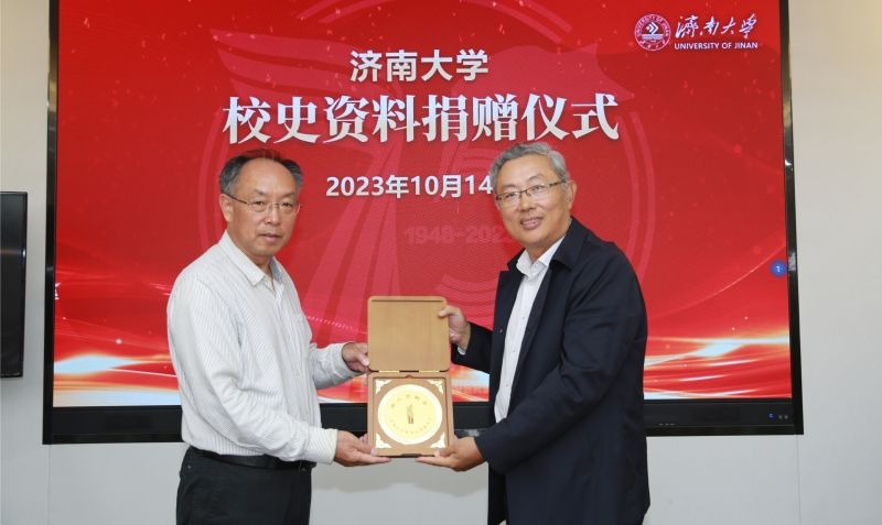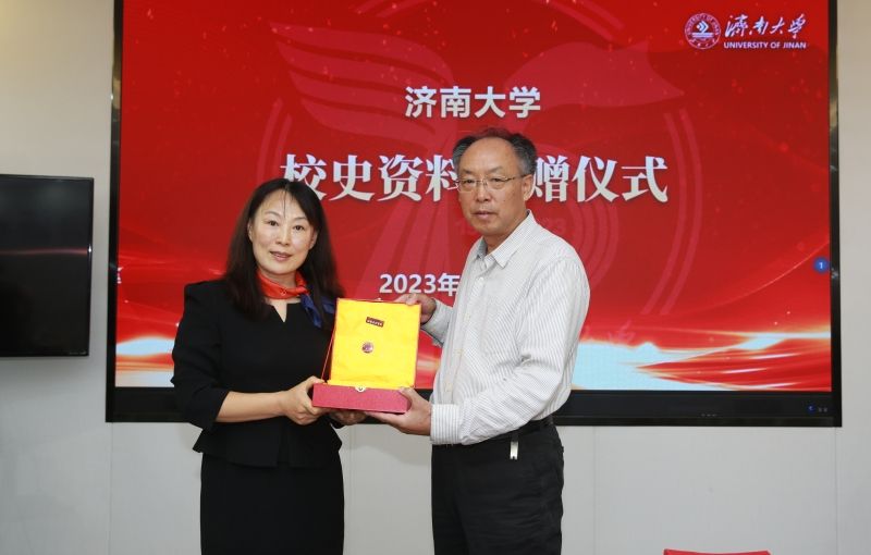 仪式上,毕叶校友介绍了这次捐赠物品的基本情况,深情回忆了父母和自己在济大的工作经历以及生活点滴。毕叶校友代表家人向ac米兰官方网站无偿捐赠其父亲毕训、母亲孙黛在学校发展早期工作时使用过的部分实物和活动照片,包括华东军政委员会工业部山东工业干部学校的早期校徽、手稿、证书、奖状在内的珍贵文物30余件。