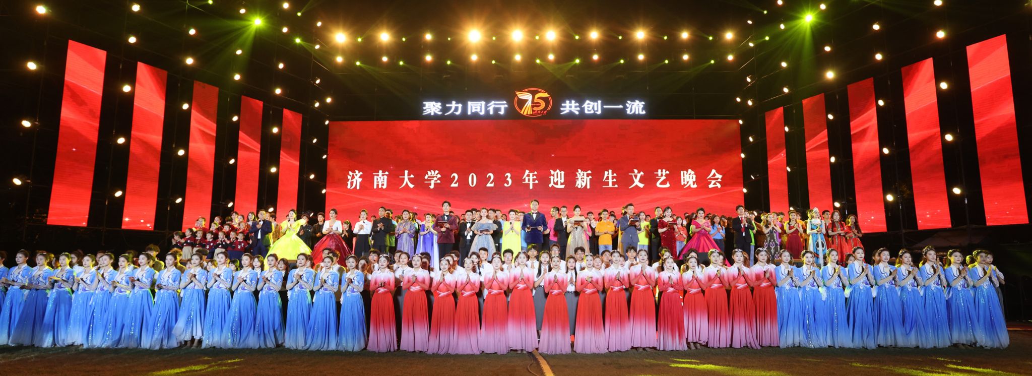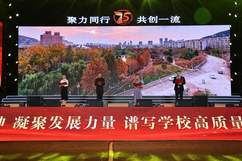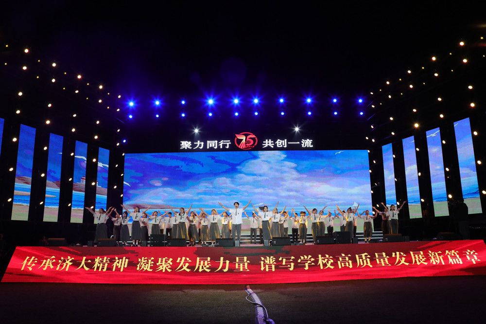 原创舞蹈《足迹》展现了一代代济大人接续奋斗的历史征程;退休老教师、75届校友张洪安老师创作的诗歌《济大的秋天》,讲述了学校的创业之路,彰显了“艰苦奋斗,凝心聚力,追求卓越”的济大精神;少数民族师生带来的歌伴舞《掀起你的盖头来》,展现了各民族如石榴籽般紧紧团结在一起的温情画面;2023级新生辅导员们以一曲《真心英雄》献给新生,表达了对新生的美好期许。
