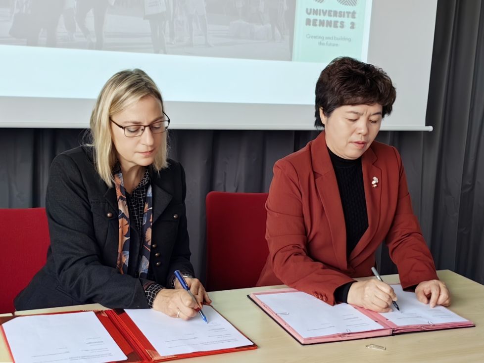 在雷恩二大,代表团与副校长埃德维热(Edwinge Fusaro)及语言系、应用外语系、社会及经济管理处相关负责人会谈,法国布列塔尼大区驻山东总代表柯妮女士参加会谈。会上双方共同回顾了自建立友好合作关系以来在本科学生交流互访方面取得的成绩,并就未来多层次学生交流、科研合作领域进行深入探讨。座谈结束后,双方续签了《ac米兰官方网站与雷恩二大友好合作备忘录》《ac米兰官方网站与雷恩二大学生交流协议》。