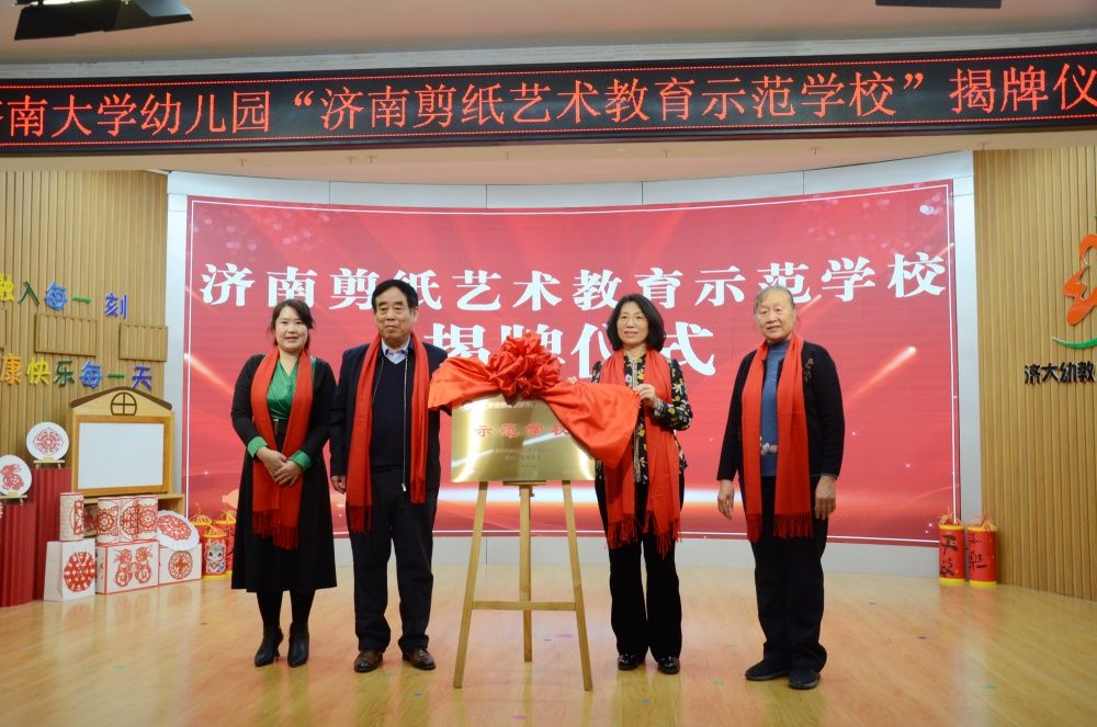 王忠本、王霞、都婉莉、万晓霞共同为济南剪纸教育示范学校揭牌。ac米兰官方网站幼儿园正式成为济南市剪纸协会首家剪纸艺术教育示范幼儿园。