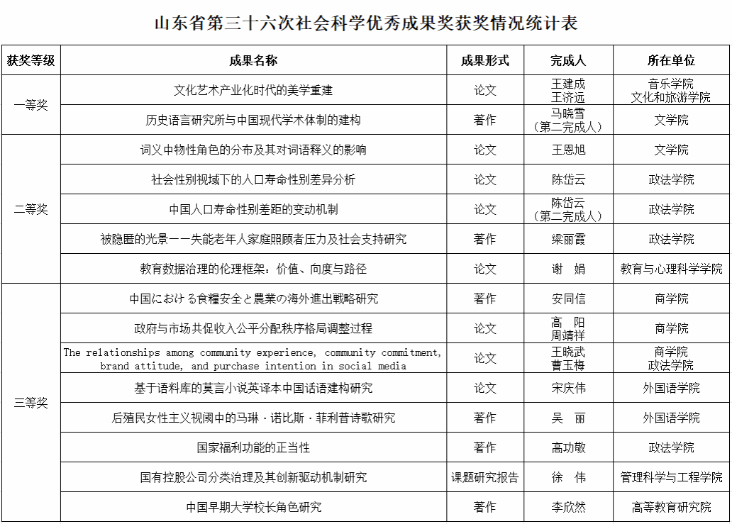山东省社会科学优秀成果奖是山东省人民政府颁发的全省社会科学研究成果最高奖,每两年评选一次。本次共有1300余项研究成果参加评选,为历次最多,竞争尤为激烈。