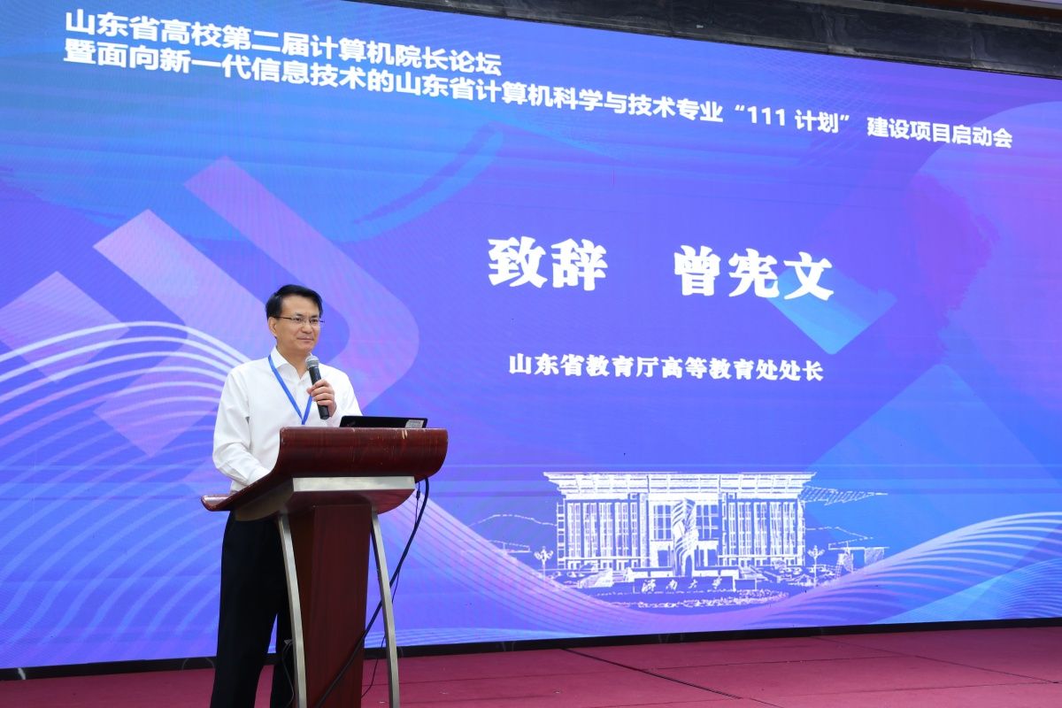曾宪文在致辞中指出,山东省教育厅在教育部的指导下,深入贯彻落实党的二十大精神,锚定“走在前、开新局”,坚持四个面向,服务高质量发展,推出一系列加快高等教育发展的创新性举措,探索实施山东省普通本科高校重点领域教学改革试点项目“111计划”。“111计划”同时也是响应教育部“101计划”的重要举措,“101计划”瞄准国际前沿和未来战略需求,体现前瞻性、引领性、基础性和理论性。“111计划”则在承接“101计划”成果的基础上,结合山东地方高校实际和山东产业实际进行转化,突出实践性、应用性、融合性、创新性,以增强人才培养的适切性为旨归,更加注重产教融合、科教融汇、协同创新。他提出,各“111计划”立项建设单位,要深入贯彻落实党的二十大精神和习近平总书记关于教育的重要论述,坚持立德树人根本任务,深刻把握教育强国建设的新部署和拔尖创新人才培养工作的新要求,推动“111计划”理念更新、质量提级,加强课程、教材、师资队伍建设,深化“人工智能+高等教育”研究与实践,为培养更多高素质创新人才作出更大贡献。