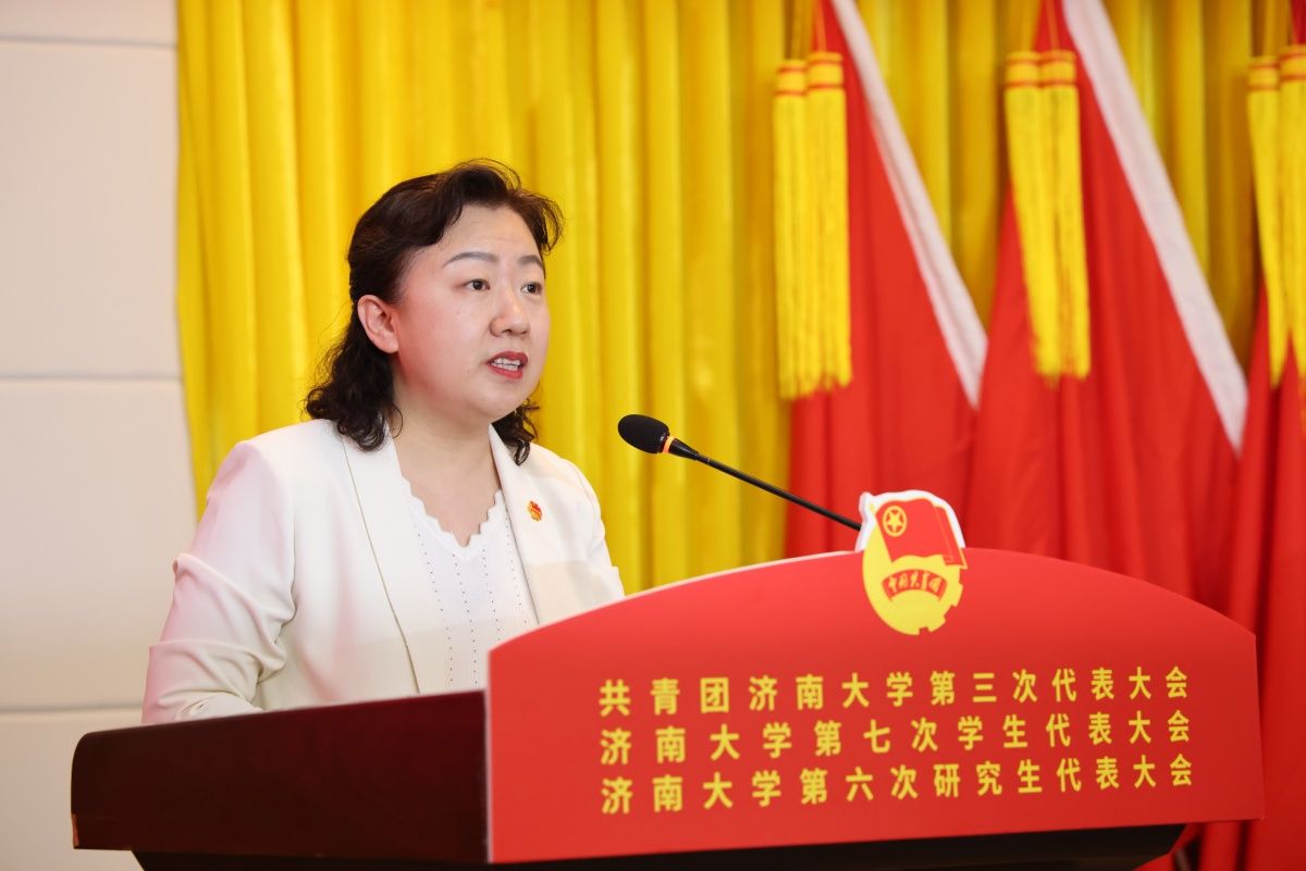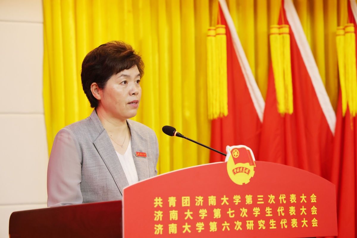 刘春华代表学校党委向大会的召开表示祝贺,向长期以来关心和支持学校共青团工作的共青团山东省委、共青团济南市委、共青团市中区委,兄弟院校及社会各界表示感谢。她在讲话中对第二次团代会以来的学校共青团工作给予充分肯定,并对学校共青团和广大青年提出三点要求和希望,一是共青团要提高政治站位,强化思想政治引领,全力服务青年成长,坚持全面从严治团,锻造走在前列的先进组织;二是广大团干部要坚持守正创新,全面提升能力水平,锤炼扎实工作作风,围绕中心服务大局,淬炼奋发有为的团干部队伍。三是广大团员青年要勇担时代使命,树牢理想信念,练就过硬本领,永葆青春本色,争做能堪重任的青年先锋。