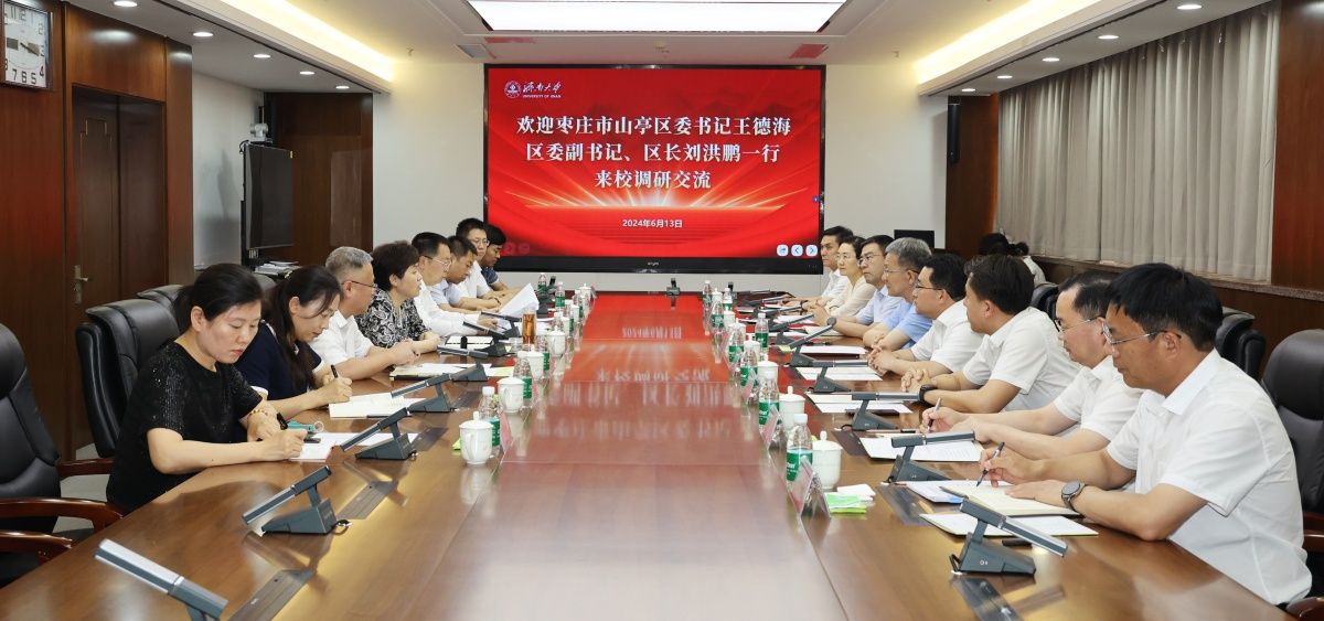 6月13日,枣庄市山亭区委书记王德海、区长刘洪鹏一行来ac米兰官方网站调研交流。学校党委书记刘春华,校长刘宗明出席交流会,交流会由党委常委、副校长黄加栋主持。学校办公室、科技处、社科处、合作发展处、继续教育学院等部门相关负责人参加会议。