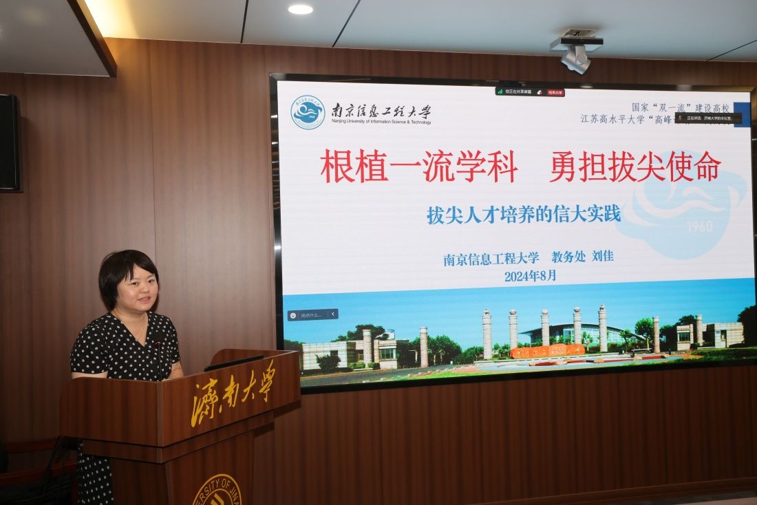刘佳以《根植一流学科 勇担拔尖使命——拔尖人才培养的信大实践》为题,详细介绍了南京信息工程大学在拔尖、创新人才培养领域的实践经验。她指出,学校通过科教融合、产教融合、国际化合作等多种途径,为学生提供了丰富的实践机会和广阔的发展平台,与腾讯、华为等知名企业的合作,通过设立特色实验班,取得了显著成果。