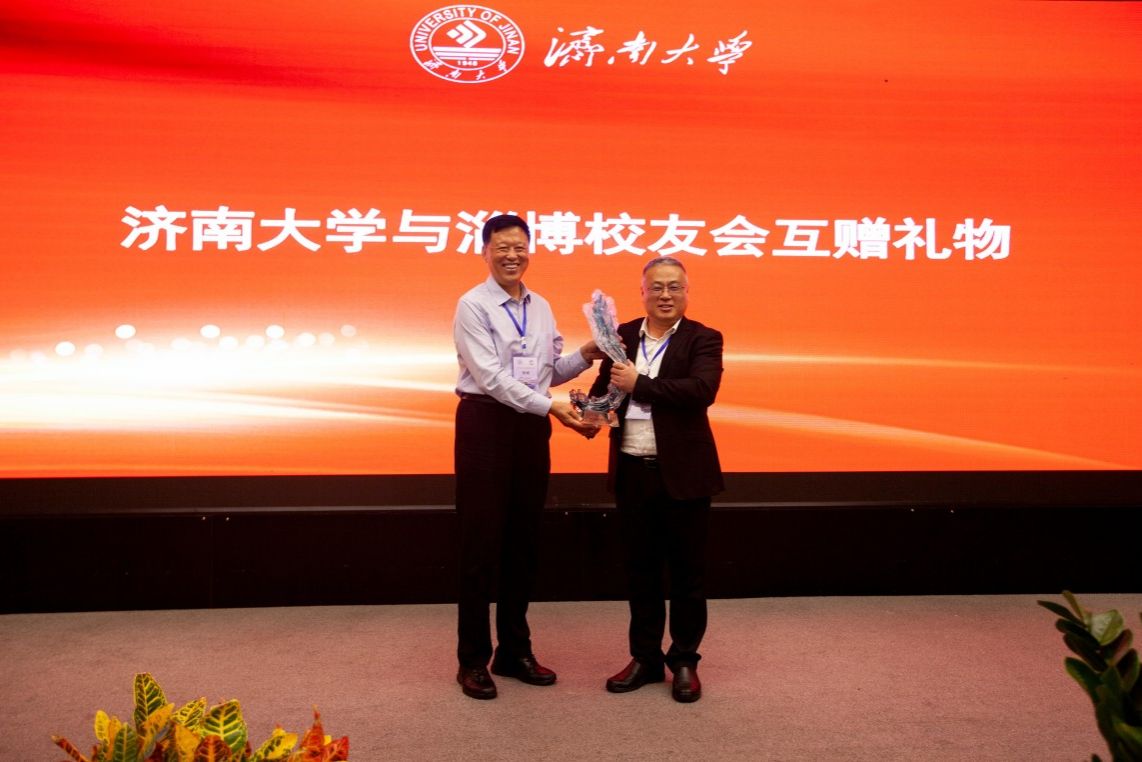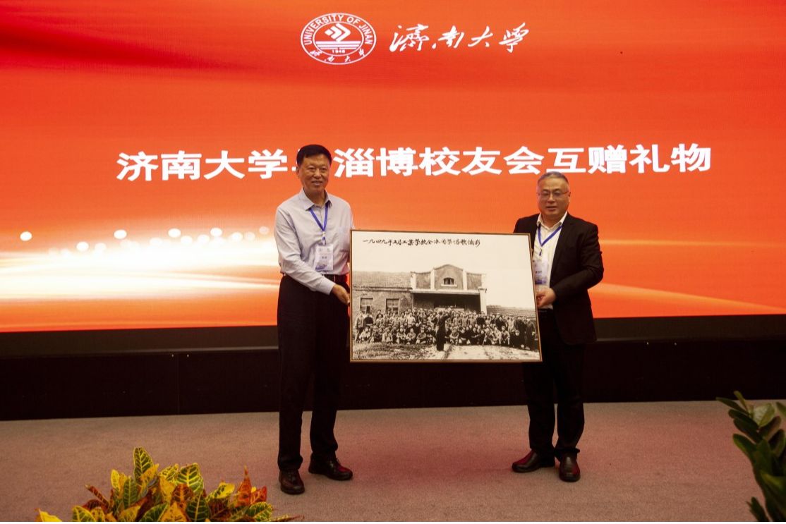 黄加栋代表学校向淄博校友会赠送1949年5月在学校博山老校区办公楼前的大合唱照片的扩印照,张斌代表淄博校友会向母校回赠淄博琉璃工艺品。礼物互赠寄托了母校和淄博校友会共同发展的美好期许。最后,大会在全体人员起立共唱ac米兰官方网站校歌中圆满结束。