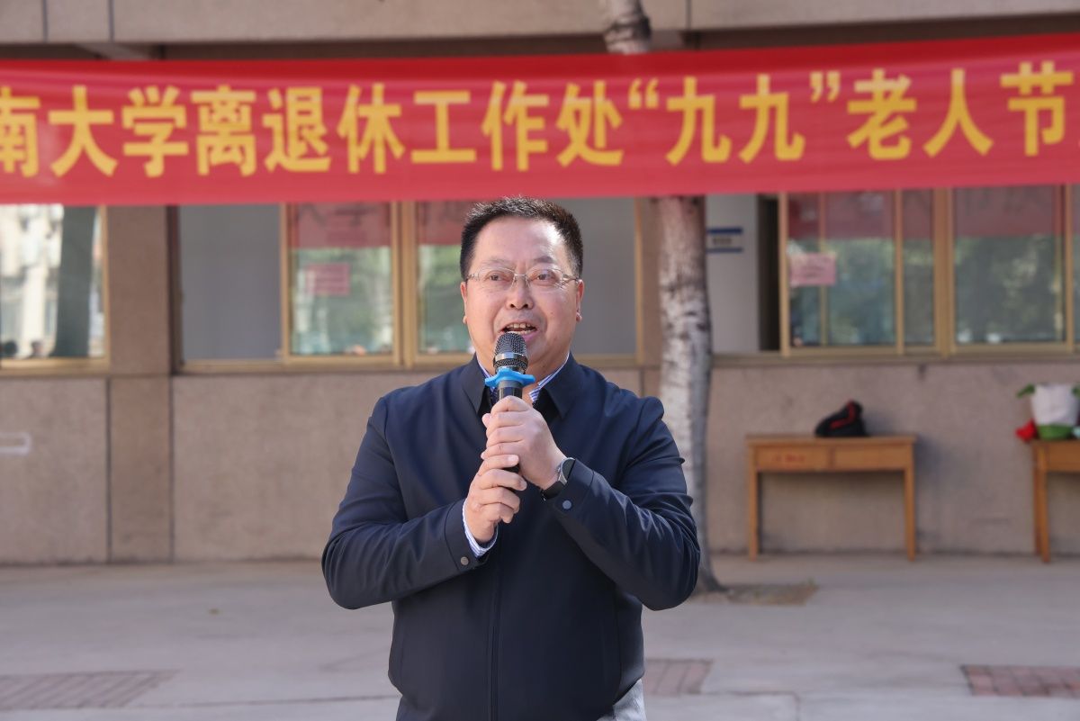 刘宗明代表学校发表讲话。他向全体离退休教职工致以节日的问候和美好的祝愿,汇报了学校的发展情况及取得的成绩,并指出,离退休教职工是学校的宝贵财富,为学校的发展奉献了青春、倾注了心血,作出了不可磨灭的贡献。离退休工作处要用心用情继续为老同志们做好精准服务,提供更好的服务和保障,学校也将一如既往地关心关爱离退休教职工,让离退休教职工在学校这个温暖的大家庭中,安享幸福的晚年生活。