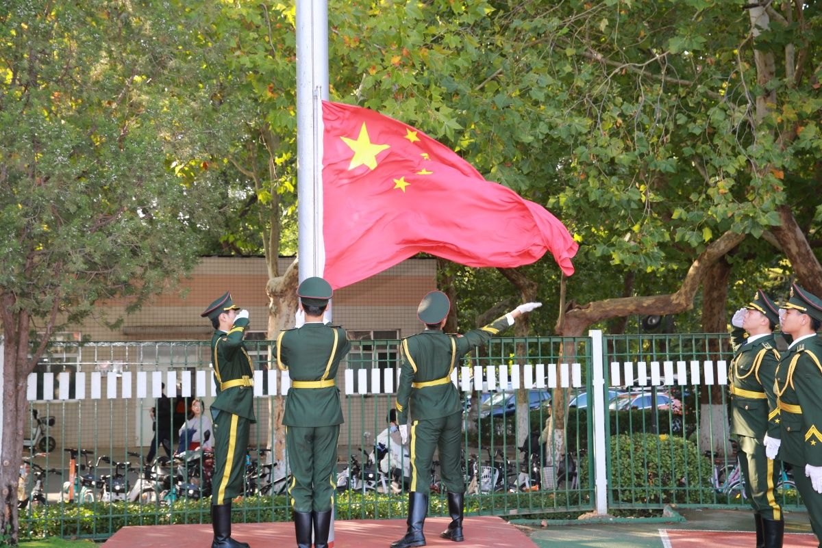 在雄壮的国歌声中,鲜艳的五星红旗在运动场上空升起。