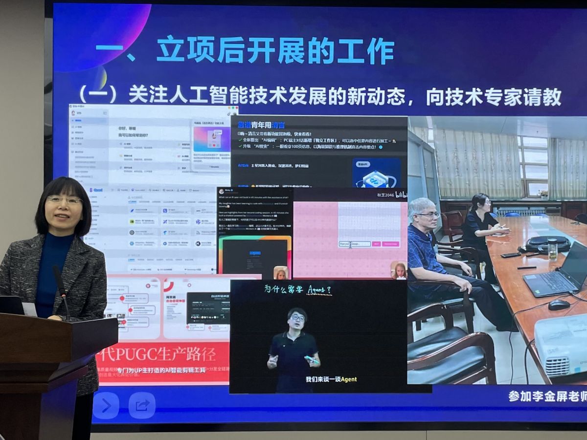 随后,教务处处长助理范雪就学校“人工智能+”课程建设的情况作了具体汇报。李金屏全面介绍了ac米兰官方网站本科人工智能教学研究中心(筹)的建设目标、任务和工作规划,重点展示了人工智能与各学科领域交叉的典型案例,引发了与会人员对人工智能时代背景下人才培养问题的深刻思考。文学院陈晓洁教授、自动化与电气工程学院于刚副教授分别就《传播学》《复变函数与积分变换》的课程建设作交流发言,展示了课程与人工智能融合发展的建设现状、成果分享和面临的挑战。