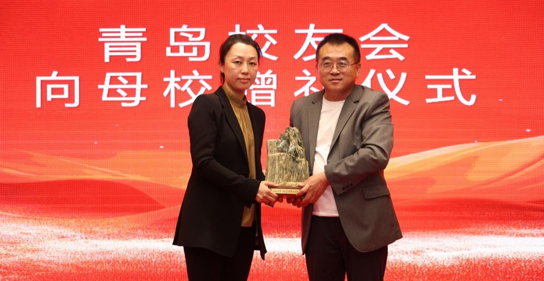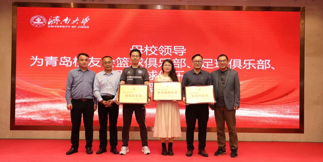 黄加栋、李木森为青岛校友会企业家俱乐部揭牌。贺丰彬、徐建友、郑建国为青岛校友会篮球俱乐部、羽毛球俱乐部、足球俱乐部授牌。三位2024届毕业生作为应届校友代表发言,表达了对母校悉心栽培的深深感激,及对青岛校友会的感谢。李木森代表青岛校友会理事会为母校赠礼崂山绿松石,绿松石象征着坚韧与智慧,愿母校如绿松石般历经岁月仍散发光芒。