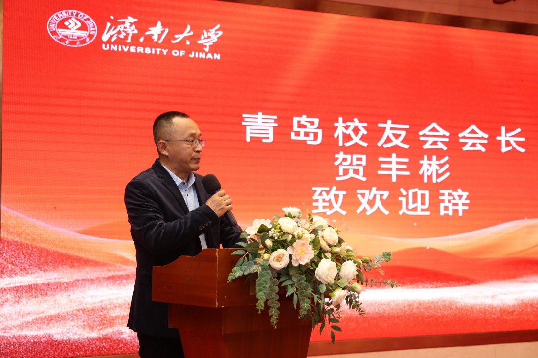 青岛校友会会长贺丰彬代表青岛校友会致欢迎辞,简要汇报了本届青岛校友会的工作成果,表达了对母校的鼓励支持、对上一届青岛校友会班子的辛苦付出和本届校友会成员的大力支持的感谢之情,并发出倡议,希望广大校友在各行各业继续发挥才干,做出更好的成绩,为母校增光添彩;更希望理事会和企业家俱乐部积极探索校企合作路径,为母校发展贡献更多校友力量。