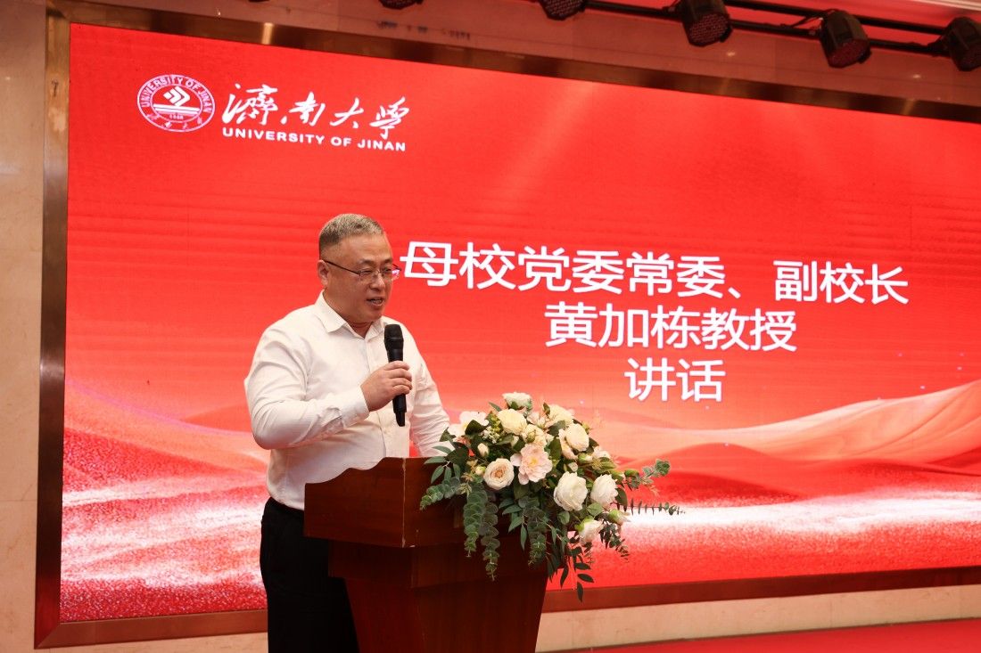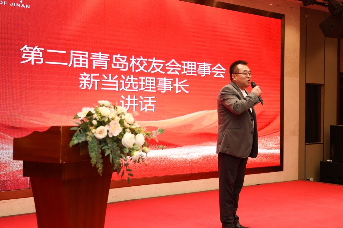 黄加栋在讲话中代表母校对第二届青岛校友会理事会暨青岛校友会企业家俱乐部成立表示热烈祝贺,向校友们汇报了母校近年来的发展及取得的成果,表示此次活动对于加强校友联系与合作、服务校友与母校发展、搭建资源交流对接平台、促进产学研融合、传承和弘扬校友文化以及支持地方经济发展等都具有重要意义,期待青岛校友会在新一届理事会的带领下,与母校校友总会及广大校友携手同行、共谱华章。
