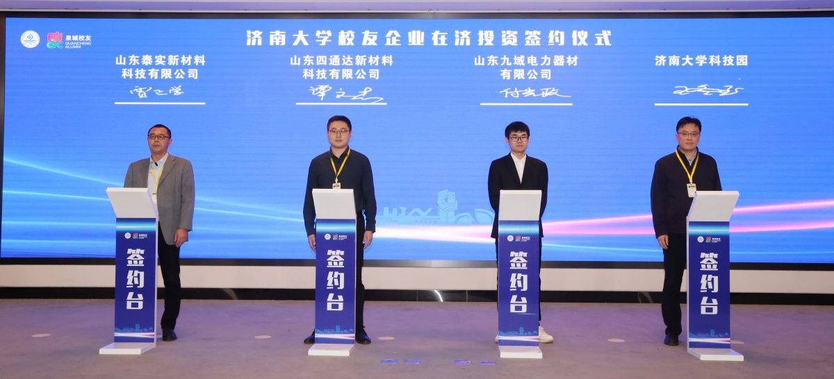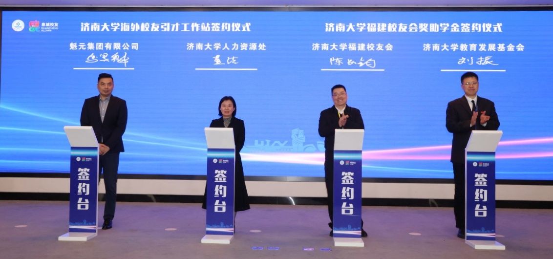 签约环节上,ac米兰官方网站科技园总经理王冬至与三家在济投资的校友企业负责人上台签署合作协议。ac米兰官方网站东南亚校友会会长、魁元集团有限公司董事长马昊魁与学校人力资源处处长董洁签署共建海外校友引才工作站协议,福建校友会秘书长陈长钧与学校教育发展基金会秘书长刘振签署福建校友会奖助学金捐赠协议。