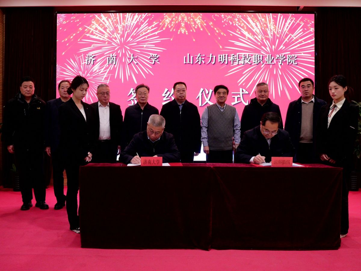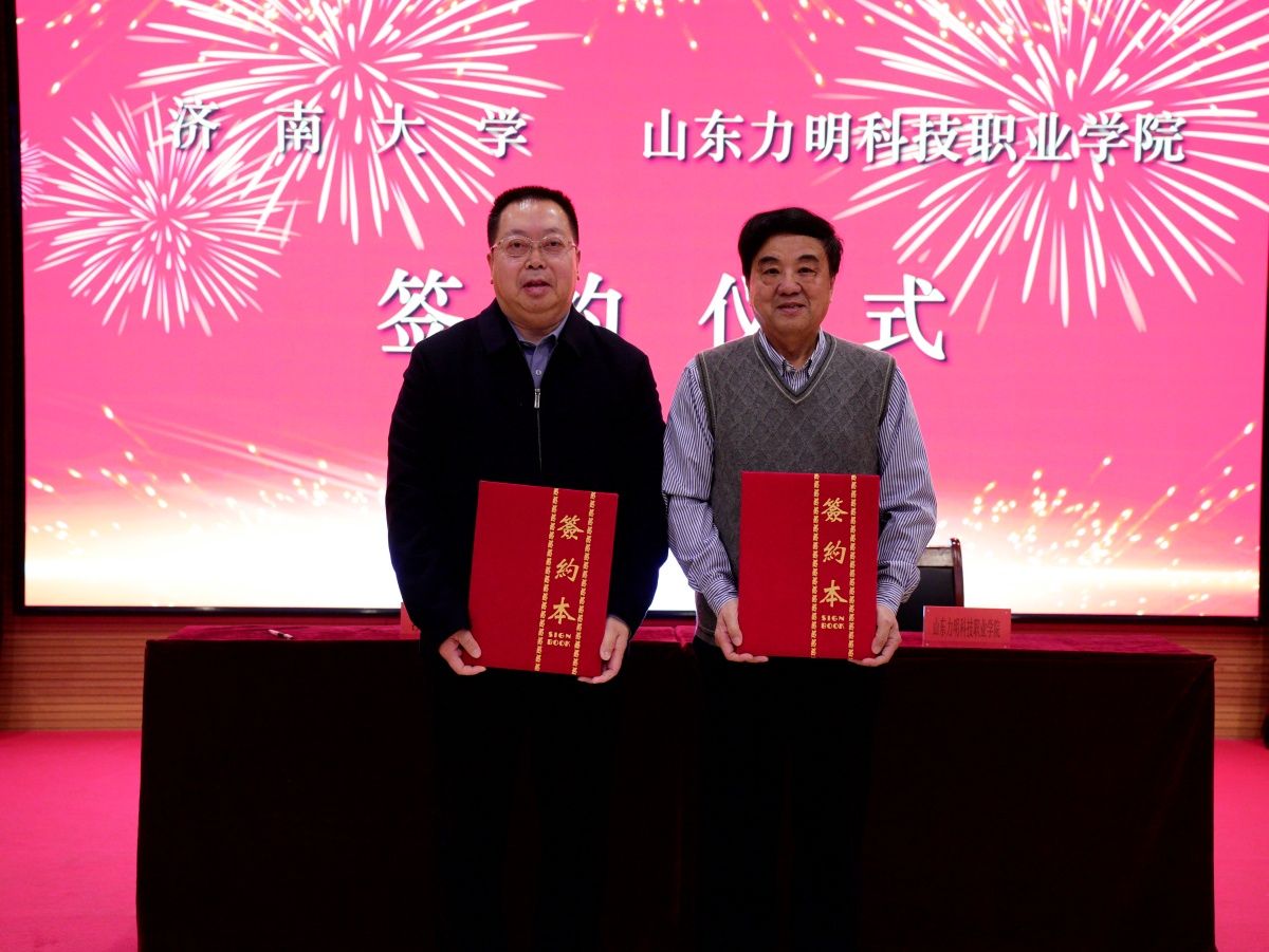 12月24日,ac米兰官方网站与山东力明科技职业学院合作签约仪式在力明学院泰安校区举行。ac米兰官方网站党委副书记、校长刘宗明,党委常委、副校长黄加栋,副校长徐征和,山东力明教育集团董事长王力一,山东力明科技职业学院党委书记张士强,党委常务副书记、代院长刘晓臣出席签约仪式。学校办公室、教师发展中心、教务处、发展规划与学科建设处、校医院相关负责同志,力明学院宫德志、沈子旺、景学安、孙宣雷等院领导参加活动。