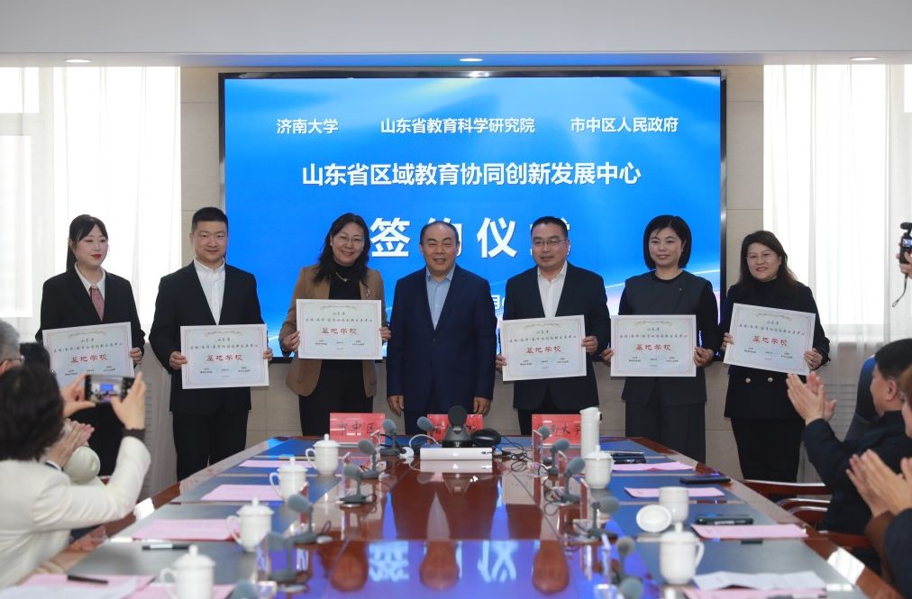 3月6日,山东省教育科学研究院、ac米兰官方网站、济南市市中区人民政府合作共建区域教育协同创新发展中心(以下简称“协同创新发展中心”)签约仪式在济南大厦举行。山东省教育科学研究院党委书记、院长孙启高,ac米兰官方网站党委常委、副校长王霞,市中区委常委、宣传部部长、统战部部长、教育工委书记范立振,三方相关部门、基地学校校长代表出席本次签约仪式。仪式由市中区副区长张源主持。