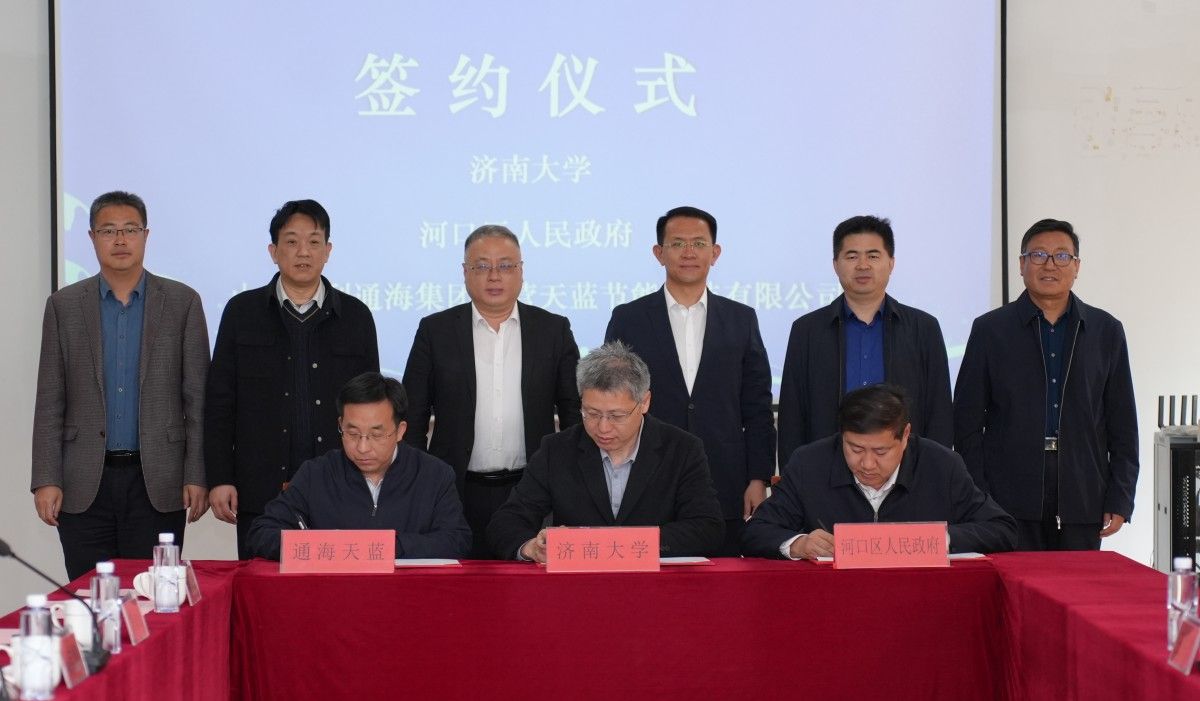 学校合作发展处处长刘振,河口区政府副区长耿蕴书,山东胜利通海集团东营天蓝节能科技有限公司总经理柴泽峰共同签订研究院共建协议。
