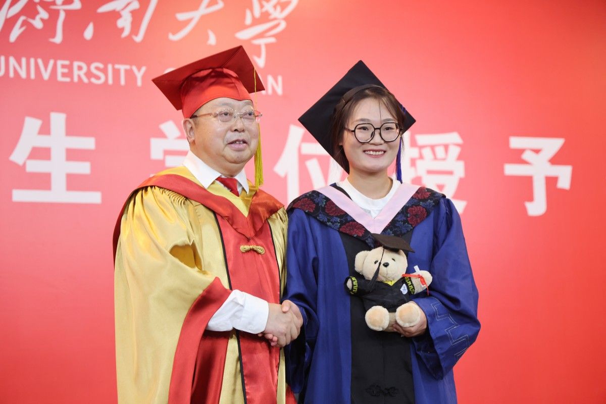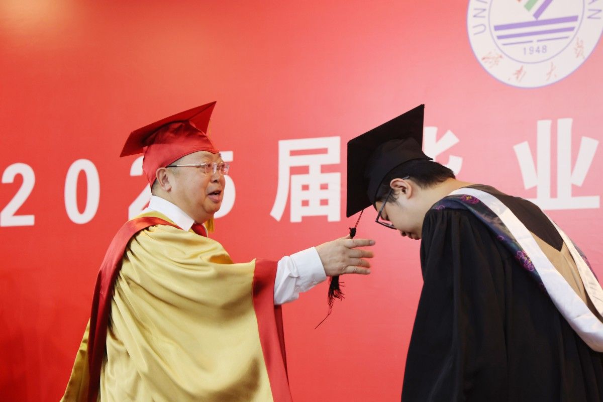 来自各学院的毕业生在师生和家长们的见证下,身着学士服、硕士服、博士服依次上台。校长刘宗明为毕业生一一拨穗、合影留念并亲切鼓励。随后,学院领导、教师和毕业生们一一握手,以表祝贺。