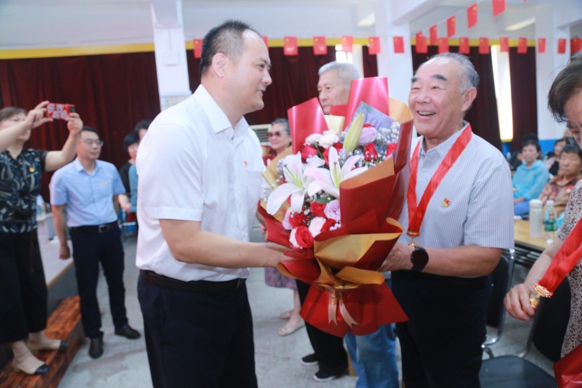 张庆国代表学校党委,向荣获“光荣在党50年”纪念章的老党员表示热烈祝贺,向一直以来关心支持学校事业发展的老党员、老同志表示衷心的感谢和崇高的敬意。他指出,党的十八大以来,习近平总书记高度重视老干部工作。党中央设立“光荣在党50年”纪念章,充分体现了以习近平同志为核心的党中央对老党员的亲切关怀和高度肯定。他表示,今年学校获得纪念章的老党员平均年龄75岁,最年长的86岁,最年轻的也年逾70岁。他们扎根党的教育事业,践行立德树人初心使命,爱岗敬业、任劳任怨,为高水平大学建设作出了重要贡献,彰显了共产党员的先锋本色。希望老党员们珍惜荣誉、保重身体,继续发扬党的光荣传统和优良作风,一如既往关心和支持学校工作,积极为学校发展建言献策、贡献力量,真正做到退休不褪色、离岗不离党。