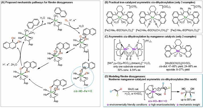 在环境友好的条件下,发展地球丰产的廉价金属催化烯烃不对称双羟化反应是合成化学和催化化学领域中重要且颇具挑战性的课题。自然界中的Rieske双加氧酶可以在绝对温和、绿色的条件下通过O2的活化将芳烃和烯烃C=C选择性地氧化为手性顺式邻二醇产物(图1A)。