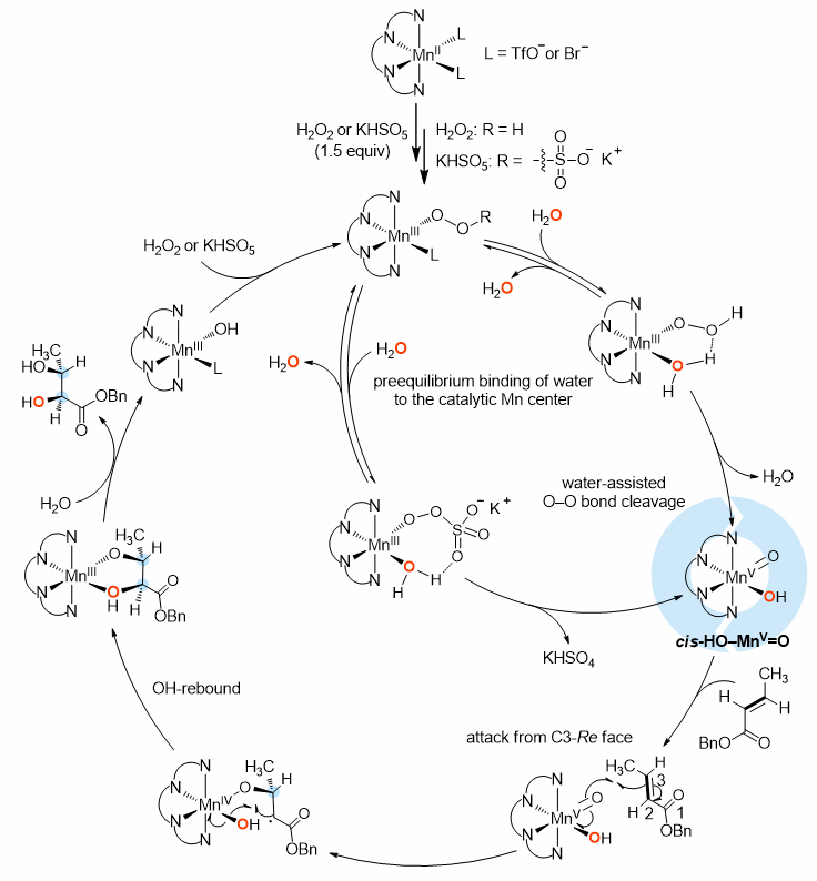 反应机理研究表明通过H2O辅助MnIII-OOH或MnIII-OOSO3–的O−O异裂生成的HO–MnV=O物种是烯烃双羟化反应的活性中间体(图2),这一研究结果使人联想到了Rieske双加氧酶催化芳烃双羟化反应中可能涉及的HO–FeV=O物种(图1A)。另外,HO–MnV=O与烯烃的反应经历了与Mn(V)配位的O原子对烯烃C=C的进攻和“OH反弹”这两步反应(图2),前一步反应的能垒较高,控制反应的对映选择性。因此,该工作首次在非血红素锰配合物催化以H2O2为氧化剂的烯烃不对称双羟化反应中复制了Rieske双加氧酶的催化功能和反应机制。