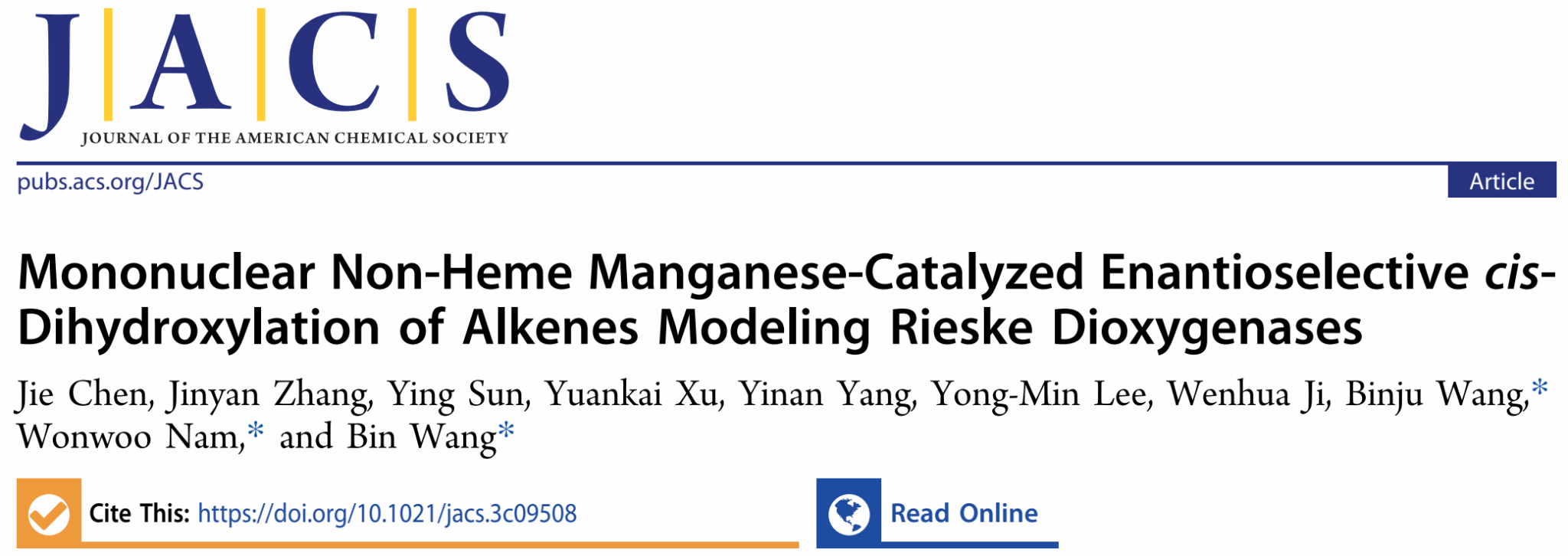 近日,ac米兰官方网站化学化工学院王斌教授课题组与厦门大学王斌举教授、韩国梨花女子大学Wonwoo Nam教授合作在国际化学领域权威期刊《美国化学会志》(J. Am. Chem. Soc. 2023, DOI:10.1021/jacs.3c09508.)发表了题为“Mononuclear Non-Heme Manganese-Catalyzed Enantioselective cis-Dihydroxylation of Alkenes Modeling Rieske Dioxygenases”的研究论文。