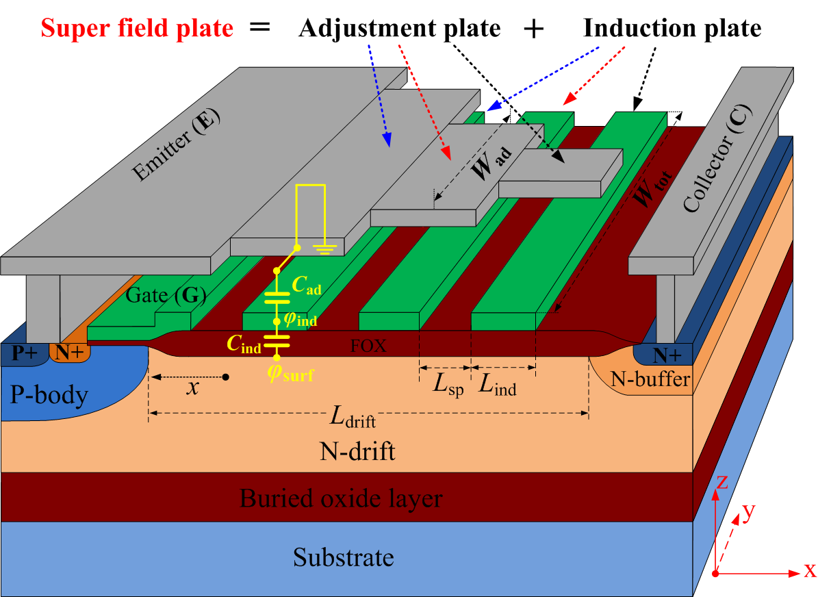 团队针对LIGBT器件耐受高电压的关键能力,从器件雪崩击穿的本质出发,根据电荷对电场影响的物理机制,设计出一种感应电荷量可控的超级场板技术。该技术利用器件场板与漂移区间形成的寄生电容,以及互连金属间的寄生电容形成串联电容结构,通过设计寄生电容设计控制器件耐压状态下的感应电荷量,并基于电荷平衡理论推导出了超级场板的参数设计方法,基于500V耐压等级的LIGBT实验结果显示,超级场板实现了均匀电场分布,将器件耐压能力提升了38.1%,达到了18.8V/μm,与目前最先进的超结技术耐压能力持平,但是,本工作所提出的超级场板技术额外具有无需占用漂移区、无需P型掺杂工艺、适用于第三代半导体器件GaN-HEMT等优点,因此,该技术相比现有技术具有明显的优势,对未来功率器件的发展具有重要推动作用。