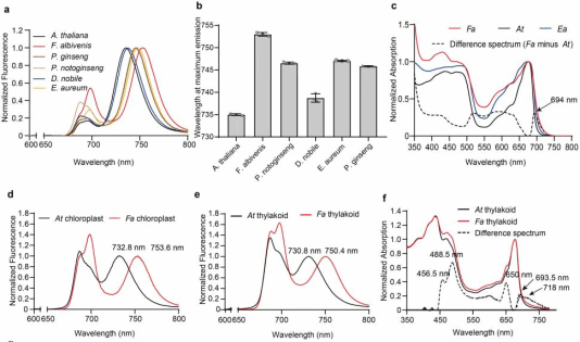 图1:与拟南芥等高等植物相比,网纹草(Fittonia albivenis)具有红移的吸收光谱和荧光光谱