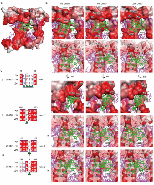 图3:Fa PSI-LHCI捕光天线Lhca3结构与其它被子植物Lhca3结构的对比推测导致叶绿素分子光谱红移的结构基础