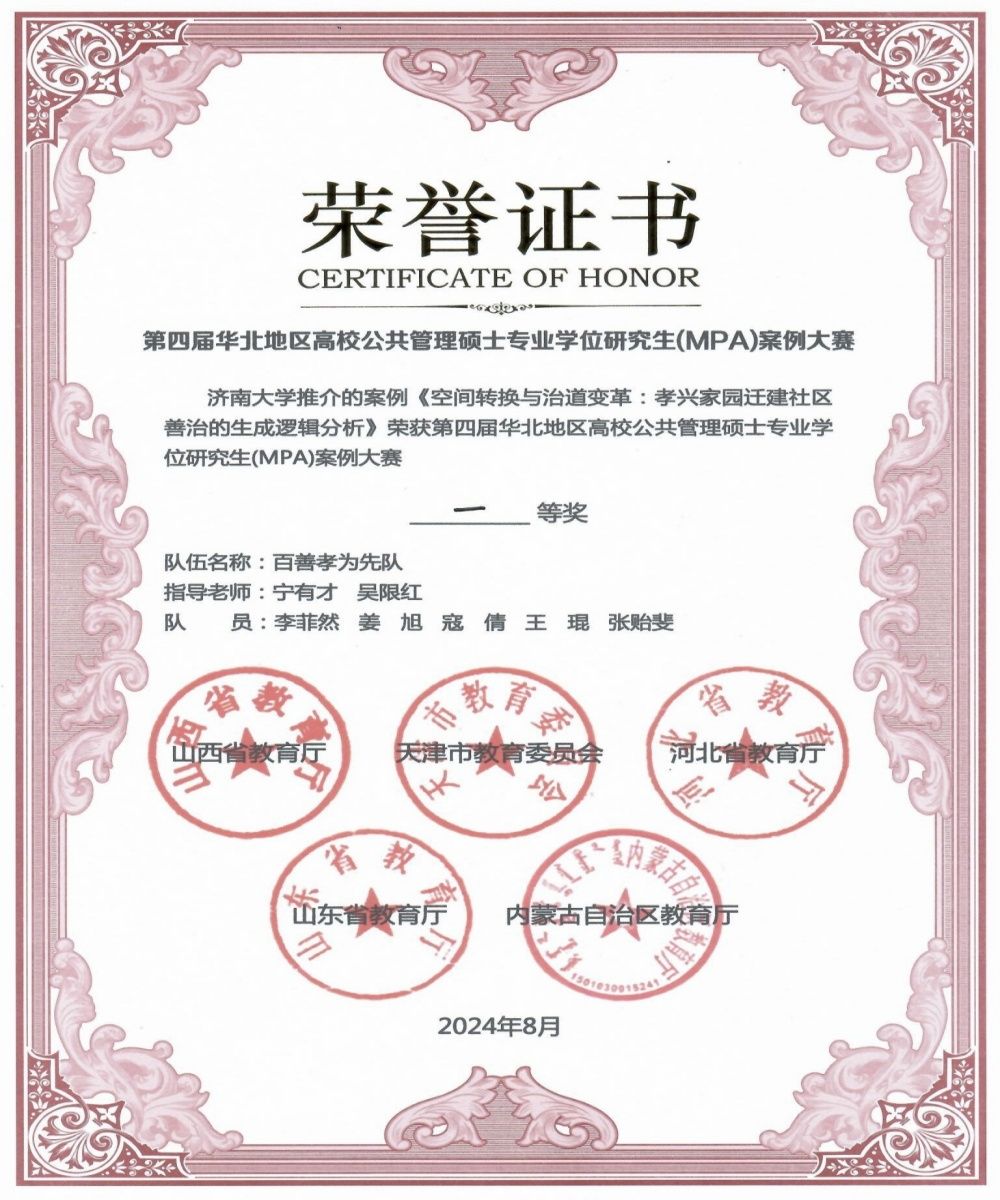本次大赛共有来自山西、天津、山东、河北、内蒙古五个省(市、自治区)高等院校的六十支队伍参加。由ac米兰政法学院教师宁有才、吴限红指导,公共管理学2023级研究生李菲然(队长)、公共管理(MPA)2022级研究生姜旭、王琨、寇倩、张贻斐组成的“百善孝为先”队代表ac米兰官方网站参赛,并提交参赛案例《空间转换与治道变革:孝兴家园迁建社区善治的生成逻辑分析》。