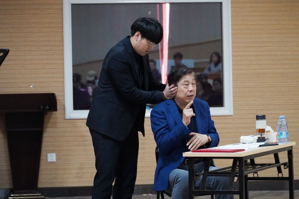 在实践指导环节,赵登营教授聆听了音乐学院六名学生的演唱,并对每位学生的演唱风格和表现进行了细致的点评。赵登营教授严谨治学的精神感染着每一个人,针对学生的具体问题,他逐一进行纠正,从上台举止、呼吸、发音到元音咬字、共鸣通道的开启,他以身示范,培养学生形成正确且全面的声乐理念。同时,他强调演唱时要时刻关注自身的歌唱状态,对腔体的控制要及时调整。在歌曲的情感处理方面,赵登营教授建议学生要深刻地了解作品背景故事,把握作品风格及情感,融入角色,从而达到感情渲染的效果。在三小时的授课过程中,赵登营教授诙谐幽默、言传身教的授课方式给大家留下深刻印象,引起了在场师生们的阵阵掌声。