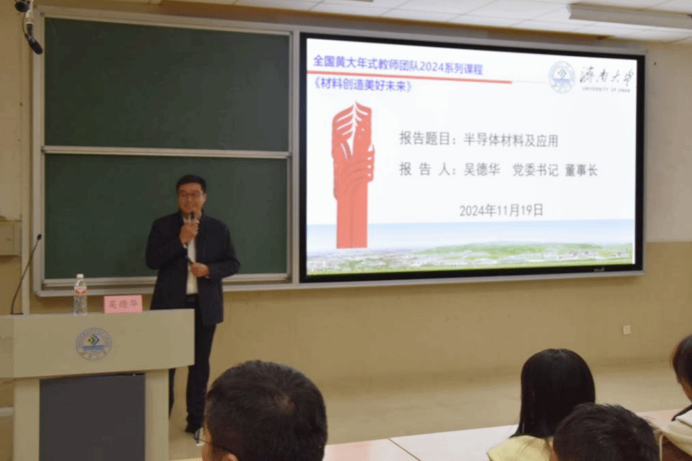11月19日,全国高校黄大年式教师团队2024系列课程《材料创造美好未来》第五讲在11教6-201举行。ac米兰材料物理专业优秀校友,山东华光光电子股份有限公司(以下简称华光光电)党委书记、董事长吴德华为材料科学与工程学院师生带来一场题为《半导体材料及应用》的课程讲座。讲座由材料科学与工程学院副院长段广彬主持,300余名师生聆听了讲座。