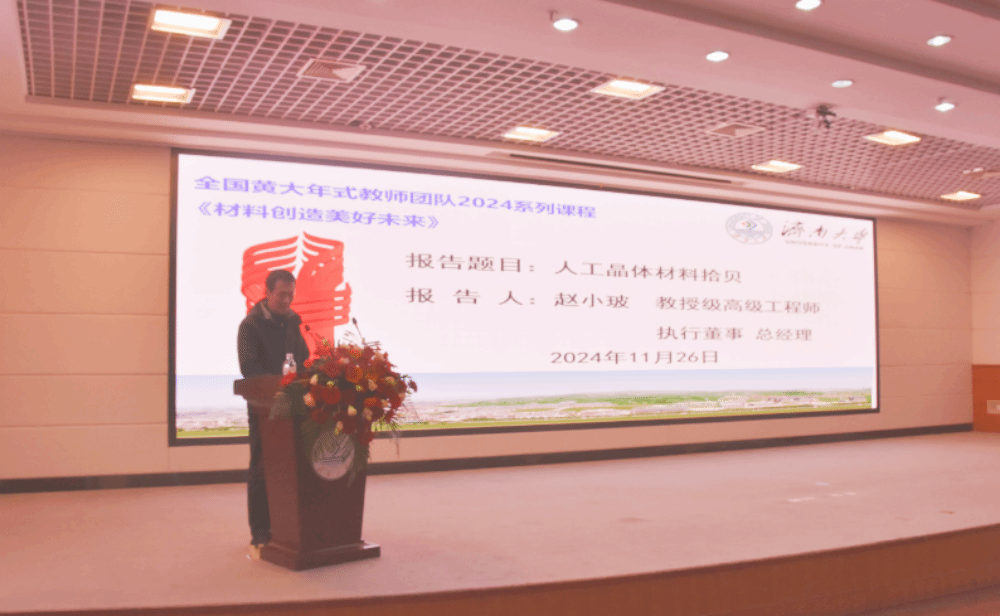 11月26日,全国高校黄大年式教师团队2024系列课程《材料创造美好未来》第六讲在ac米兰官方网站第一学术报告厅举行,ac米兰材料科学与工程专业98级优秀校友、中材人工晶体研究院(山东)有限公司执行董事兼总经理赵小玻为材料科学与工程学院师生带来一场题为《人工晶体材料拾贝》的课程讲座。讲座由材料科学与工程学院副院长段广彬主持,300余名师生聆听了讲座,并进行了现场交流。