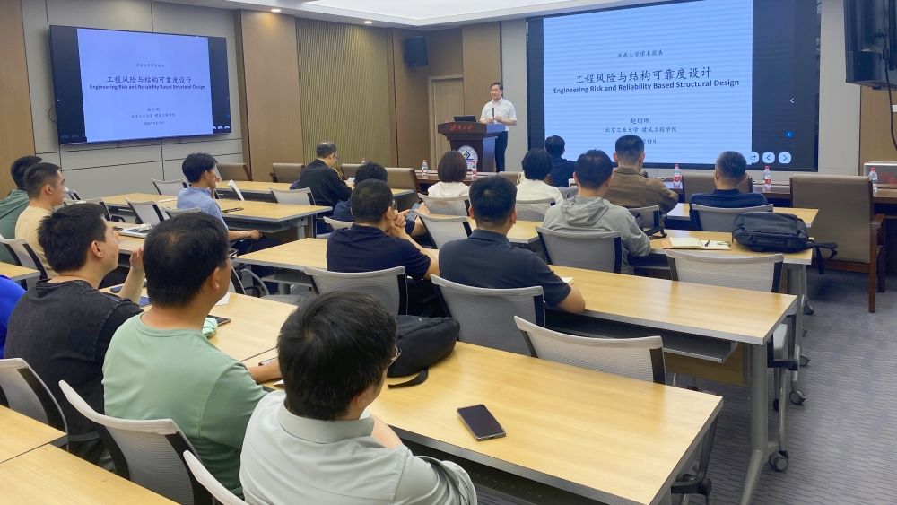 在第五学术报告厅,赵衍刚教授作《工程风险与结构可靠度设计》学术报告。赵衍刚教授从工程风险与结构可靠度、荷载抗力系数的基本概念、荷载抗力系数的传统算法以及荷载抗力系数的实用算法对工程风险与结构可靠度设计的关键问题进行了讲解,报告内容深入浅出、生动翔实。报告会后,赵衍刚教授同广大师生进行了热情交流。