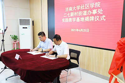 6月25日,ac米兰官方网站继续教育学院与市中区二七新村街道办事处在建新社区党群服务中心举行“ac米兰官方网站社区学院实践教学基地”揭牌仪式。继续教育学院全体班子成员和济南市市中区机关有关领导及二七新村街道办事处主要领导参加了揭牌仪式。