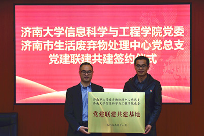 济南市生活废弃物处理中心党总支是信息科学与工程学院党委与莱芜官场村党总支、济南乐山小区党支部、潍坊滨海科技创新园党委联建共建后的第四个党建共建基地,是学院党委持续推进校地合作、服务地方发展的又一重要平台。下一步,双方将以此次签约揭牌仪式为契机,发挥党建引领作用,在生活废弃物处置信息化建设、师生环保教育等各个方面加强合作,充分利用双方资源,发挥各自优势,实现双方工作互促互学、合作提升的共同愿景,进而为济南市发展方式绿色转型、城市生态环境信息化建设工作贡献力量。