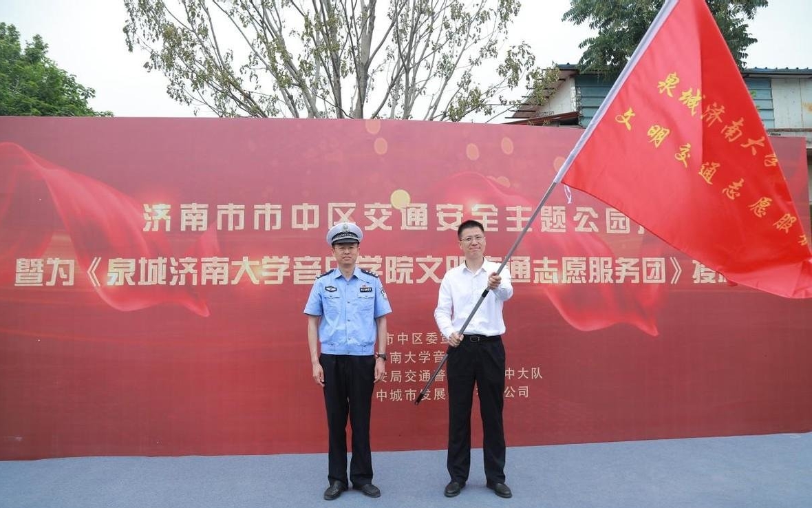 活动现场,尹治国为“ac米兰官方网站音乐学院泉城文明交通志愿服务团”授旗。与会领导集体上台剪彩,宣布济南市市中区交通安全主题公园正式开放。