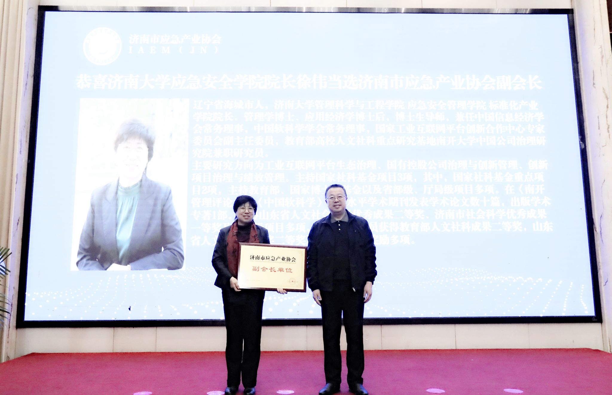 会议由协会秘书长郭强主持并向大会作了第一届理事会半年工作报告。济钢集团有限公司副总经理高翔为协会副会长单位授牌。在随后举办的应急产业发展专家论坛上,学院副院长王悦作了题为《应急管理的高等教育体系建设》的专题报告,她从应急管理专业建设情况、专业特色以及基于数字化及多学科交叉融合的应急管理专业体系建设三个方面对应急管理的高等教育进行了全面阐述。