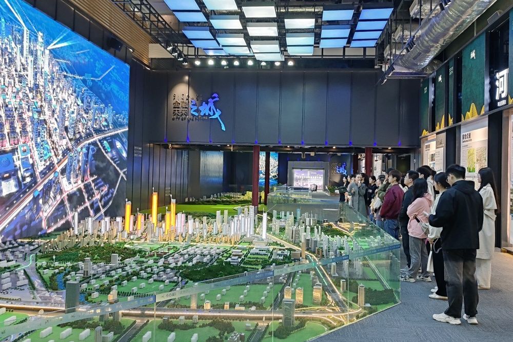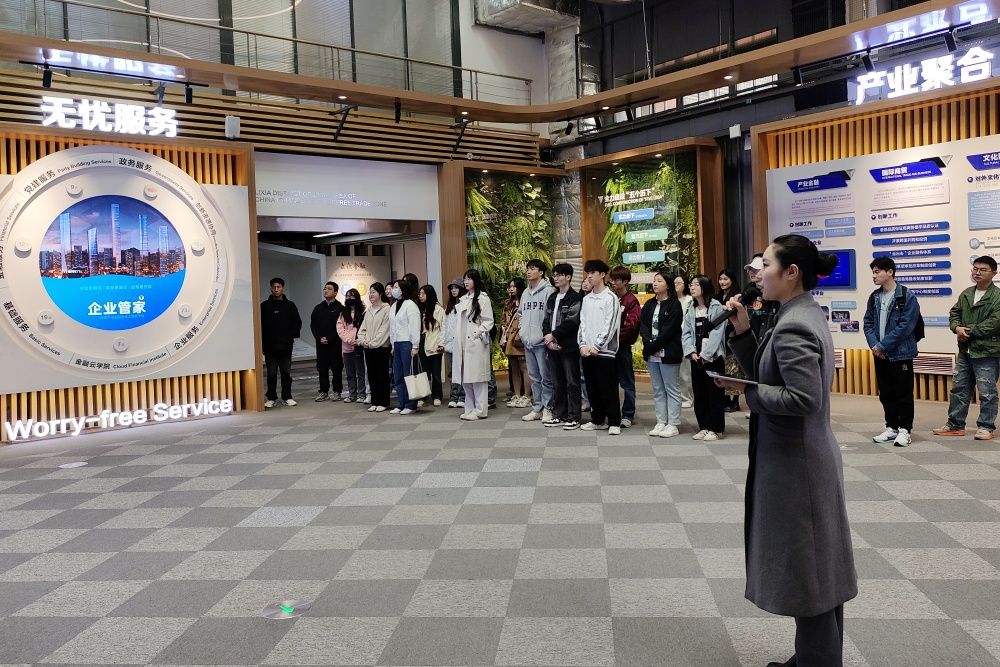 师生一行首先来到济南中央商务区的文化服务中心,了解济南中央商务区的发展历程、建设情况和入驻企业等。通过宣传短片和讲解员的细致讲解,学生深度感受到中央商务区日新月异的变化,了解了驻济企业的数量、规模、企业类型以及企业招聘信息。
