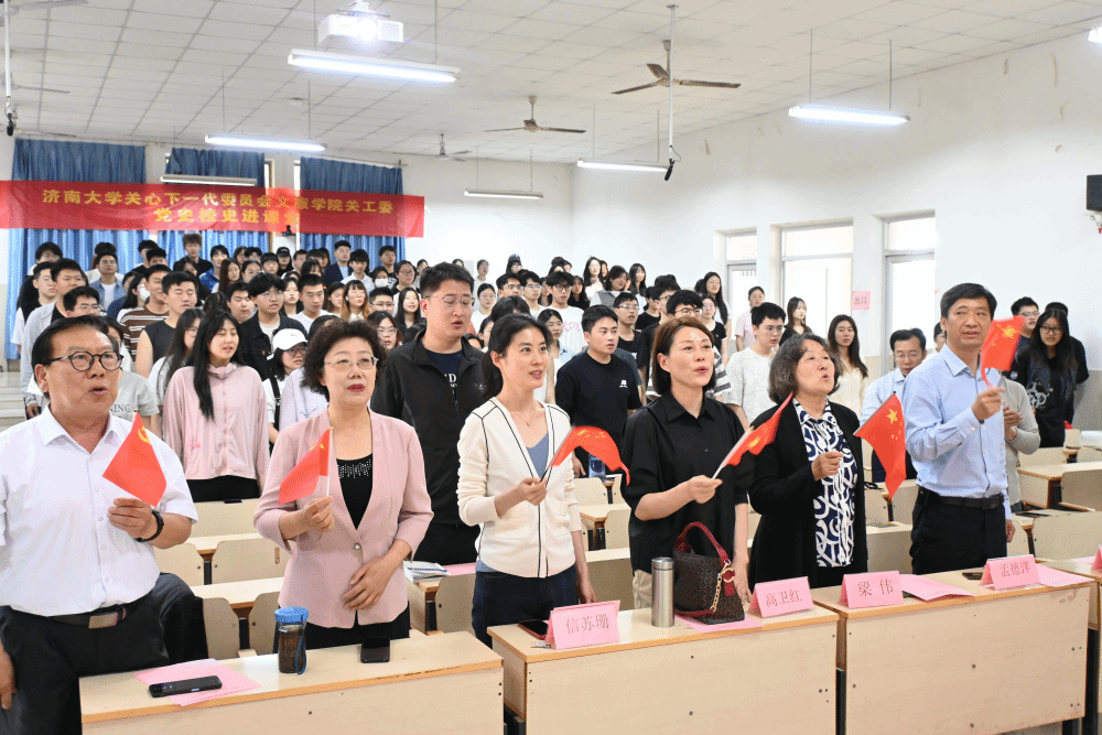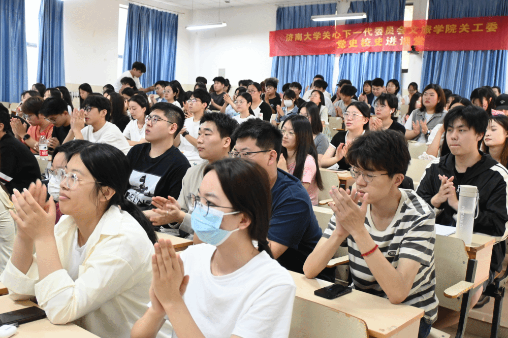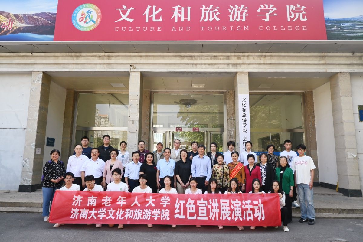 为进一步弘扬爱国主义精神,传承红色基因,加强党史学习教育,深化校际交流合作。4月27日,文化和旅游学院与济南老年人大学、ac米兰官方网站关心下一代工作委员会(以下简称关工委)联合开展了红色宣讲展演暨党史校史进课堂活动。济南老年人大学关工委副主任、志愿服务团团长张建军,ac米兰官方网站关工委副主任梁伟,ac米兰官方网站离退休工作处处长、关工委秘书长高卫红,ac米兰官方网站文化和旅游学院党委书记孟德洋,学院党委副书记、副院长信苏珊出席活动,济南老年人大学宣讲团、文旅学院全体学生党员、新一期积极分子、青马工程学员、教师代表共200余人参加活动。