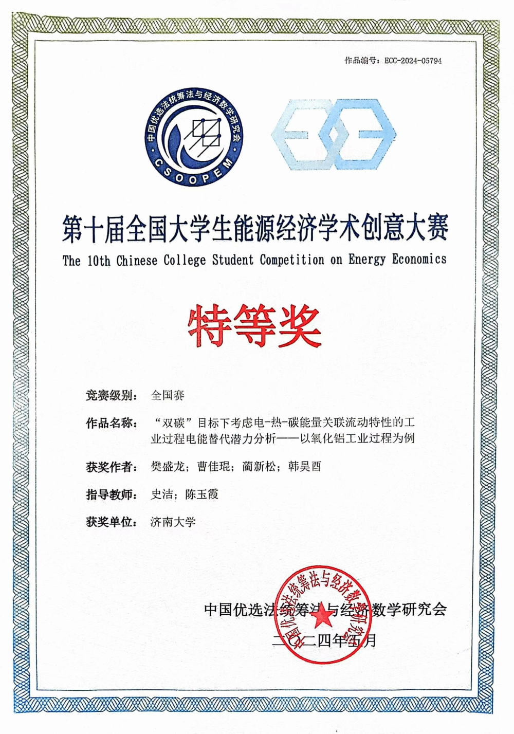 5月18日至19日,第十届全国大学生能源经济学术创意大赛在中国地质大学(北京)举行。由ac米兰物理科学与技术学院史洁、陈玉霞老师指导完成的《“双碳”目标下考虑电-热-碳能量关联流动特性的工业过程电能替代潜力分析——以氧化铝工业过程为例》项目荣获大学生组特等奖。