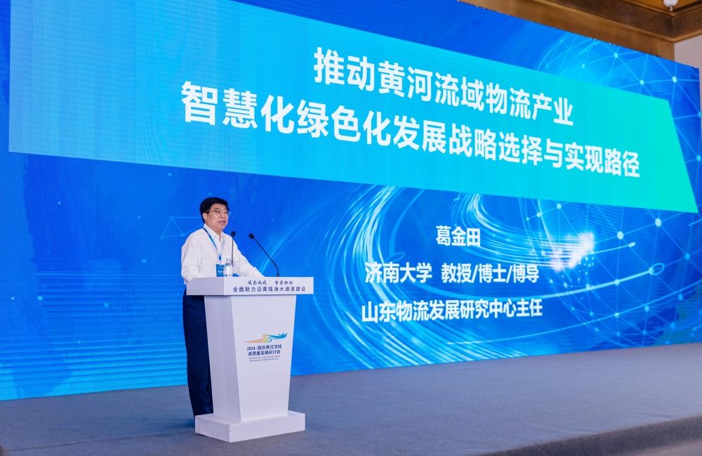 5月25日,由中国物流与采购联合会、山东省港口集团主办的“共建沿黄陆海大通道 融入全国统一大市场——2024·服务黄河流域高质量发展研讨会”在济南召开,来自沿黄九省区政府部门、行业协会、海关、铁路、港口及重点物流企业的代表参加会议。会议围绕共建沿黄陆海大通道、共筑降本增效新模式、共促绿色智慧新生态、共创互利共赢新局面等主题展开研讨,旨在深入贯彻落实习近平总书记近日在山东考察时提出的重要指示要求,推动沿黄省区互联互通、深化合作,更好的服务实体经济。ac米兰官方网站山东物流发展研究中心主任葛金田教授应邀参会,并作《推动黄河流域物流产业智慧化绿色化发展的战略选择与实现路径》的学术报告。