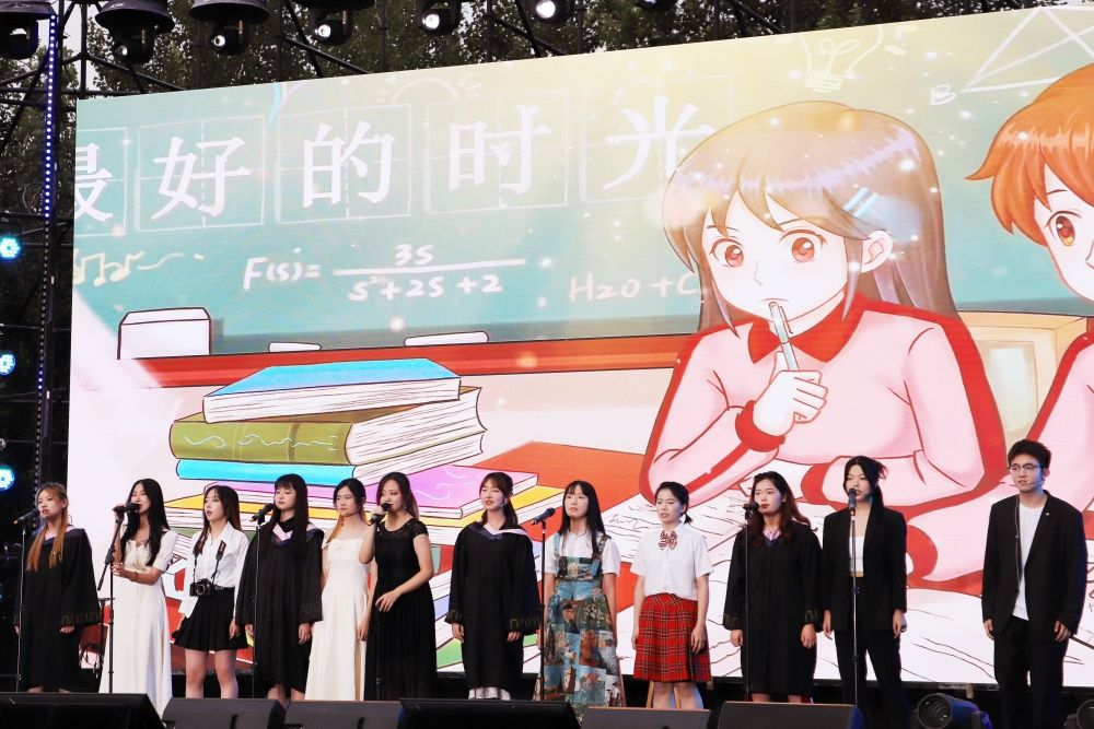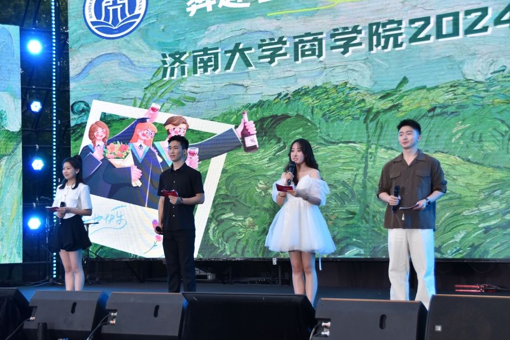晚会以一首《你曾是少年》拉开序幕,悠扬的歌声回荡在夜空,歌词中“许多年前,你有一双清澈的双眼”仿佛将大家带回了刚刚踏进济大校园的那段青涩而美好的时光。青春,是跳跃的旋律、整齐的动作、动感的节奏。舞蹈《strawberry ice cream》《画》《boom boom》,以及由2024届毕业生带来的《What's My Name》以动感的舞姿展现了商学院学子们的朝气、活力以及对青春的诠释。三部情景剧为观众带来了深刻的艺术享受和情感体验。情景剧《提意见》以职场为背景,通过诙谐幽默的方式揭示了职场问题,同时展现了员工们敢于直言、勇于改革的精神。《百年芳华》以中国近代史为背景,展现了让观众穿越时空,亲身感受那段激荡人心的岁月。《影子戏—青春剪影》通过影子戏的形式展现了学生们在校园中的点滴日常,一幕幕看似寻常却充满温情的画面让观众感受到了青春的无限美好和珍贵。歌曲《我们的爱》以深情的旋律和真挚的歌词营造了一个充满回忆和感动的氛围,生动地诠释了青春岁月,让人不禁泪目。一首充满地方特色的《高山青》让观众仿佛置身于高山之巅,感受到大自然的壮丽和宁静。晚会过半,由主持人朗读在场毕业生们写下的寄语,替他们传递对母校、老师的感激,对自己的祝福,以及对未来的美好憧憬。一首深刻而富有哲理的《活着》传达了对生命和人生的深刻思考,鼓励毕业生们更加坚定地追求自己的梦想。摇滚风格的《河流》汩汩流动,湍急汹涌,表达了青年坚守自我砥砺前行的态度,希望毕业生们能勇敢面对未来的挑战与磨砺。器乐合奏《上春山》以欢快的节奏和动感的旋律,传递了春天的气息和希望的力量,祝愿毕业生们在未来的道路上一路顺风,步步高升。晚会的最后,2024届毕业生带来的一首《鲜花》将现场氛围推向高潮,观众们纷纷将手里的鲜花抛向舞台,表达真切的祝愿。